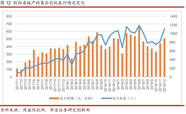 用益信托网统计的房地产类荟萃信托的数据显示,,,,,2017-2019年三年房地产类荟萃信托刊行规模划分为5921亿、9209亿和9965亿元,,,,,2018年和2019年的同比增速划分为55.54%和8.2%。。。。。。就2019年来看,,,,,上半年刊行规模显着上涨,,,,,而下半年则有所下降。。。。。。详细来看,,,,,2019年上半年房地产类荟萃信托刊行规模5525亿,,,,,同比增添26.33%,,,,,而下半年刊行规模4440亿元,,,,,同比下降8.19%。。。。。。主要缘故原由在于:以5月17日“23号文”的宣布为标记,,,,,地产调控进一步收紧,,,,,尤其地产融资的多个渠道均受到了显着的限制。。。。。。5月,,,,,银保监会发下“23号文”,,,,,要求不得向“四证不全”、开发商或其控股股东资质不达标、资源金未足额到位的房地产开发项目直接提供融资;;;;;;2019年7月和8月,,,,,银保监会对部分房地产信托营业增速过快、体量较大信托公司举行约谈,,,,,继续坚持房地产信托调控力度,,,,,并举行余额管控,,,,,即逐日时点规模不得凌驾6月30日之前的房地产信托规模。。。。。。在羁系压力之下,,,,,使得投向房地产的信托资金规??????焖佟吧渤怠。。。。。。